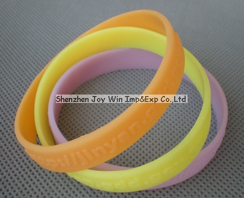 Material:siilcone MOQ:200pcs/size/style/color 1.Size:Circumference x width x Thickness Adult:202mmx12mmx2mm-----8"(C)x1/2"(W)x1/16"(T) Women:190mmx12mmx2mm----7.5"(C)x1/2"(W)x1/16"(T) Young people:180mmx12mmx2mm---7.5"(C)x1/2"(W)x1/16"(T) Child:150mmx12mmx2mm---7"(C)x1/2"(W)x1/16"(T) 2.Logo finish: Debossed,embossed,imprint,segment,glowing etc. 3.Color:could make customized color accord to Pantone color chart.Different color on behalf of different organization or message as follows: White:Make poverty history Yellow:Livestrong White+black(Nike):Stand up speak up Blue(BBD radio):Beat bullying Pink(BBC radio):Support knowledge strength Red(BHF):Feel the pulse Dark blue/blue+white:One word,one cause/Tusunami Relief Blue+green:Say no to secterianism 4.Remark: The silicone wristband is suitable for birthday party,family reunions,presidental converntions,school events,colleges oversites,business,organizations foundations,sports programs,teams,clubs and other occations.etc |